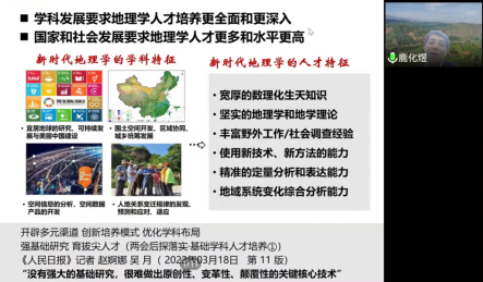 鹿教授通过对地理学概念、内涵及其分支学科内容的解读,分析了地理学的学科特点、地理学在科学发现、社会服务和认识世界中的重要地位,以及地理学在解决人类社会面临的环境、资源和发展、自然灾害、气候变化问题中的重要作用。紧密结合“双碳”主题,讲解前沿的科学问题如何参与解决社会、经济发展中的问题。同时,他结合南京大学百年地理学学科建设和人才培养工作,以及中外对地理学人才的需求,认为基础宽厚、科学水平高和实践能力强是培养青年地理学生的要求,是促进未来地理学发展的必由之路。