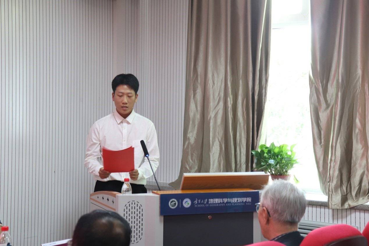 在校生代表王晨阳说“站在历史的节点上,身后的荒芜早已变了模样,明日的路定是花繁锦簇,愿吾辈敢想敢做、敢拼敢闯,用实践赋予‘地理’二字新时代的意义。”