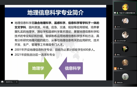 佘璐主任介绍了地理信息科学专业的人才培养方案。她指出,本专业作为交叉学科,在培养中注重严谨的科学思维,要求同学们能够综合运用数学、计算机科学、地理学等相关专业知识与技能解决社会经济发展中的实际问题。